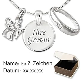 CLEVER SCHMUCK Set mit Gravur: 3 Silberne Anhänger Gravurplatte 12 mm inkl. Gravur einseitig + Mini Engel 10 mm Herz in der Hand + wählbarem Zirkonia-Taufring und Kette STERLING SILBER 925 im Etui
