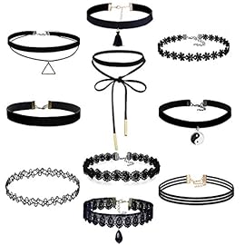 10 Stück Choker Halsketten Set Velvet Spitze Tattoo Halsketten Stretch Elastische Tassel Ketten, Schwarz