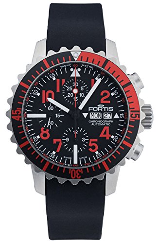 Fortis B-42 Marinemaster Day/Rendezvous Automatic Chronograph Stainless Steel Mens Strap Watch Fotomodell# 671.23.43 Kalium / 671-23-43-Kalium. The watch case is crafted from brushed stainless steel and is presented on the black caoutchouc rubber strap, black & red monochromatisch-directional rotating bezel, black dial sine temporewith black & luminous hand indicators, red & luminous sweep seconds hand, Red Arabic Zahlwort hour markers and luminous nicht & dot hour markers, Day of week in English & German displayed at the 3 o’clock position, Rendezvous display at the 3 o’clock position, Chronograph Functions; 30 minutes, 12 hours and 60 Seconds, Scratch Resistant Sapphire Crystal, Solid case back, Swiss Automatic self-winding Chronograph movement, ETA 7750, Water resistant to 20 atm/200 meters/660 feet. As all of our watches, this Fortis B-42 Marinemaster Gents watch is BRAND NEW, and comes in its genuin packaging with the warranty card and papers!